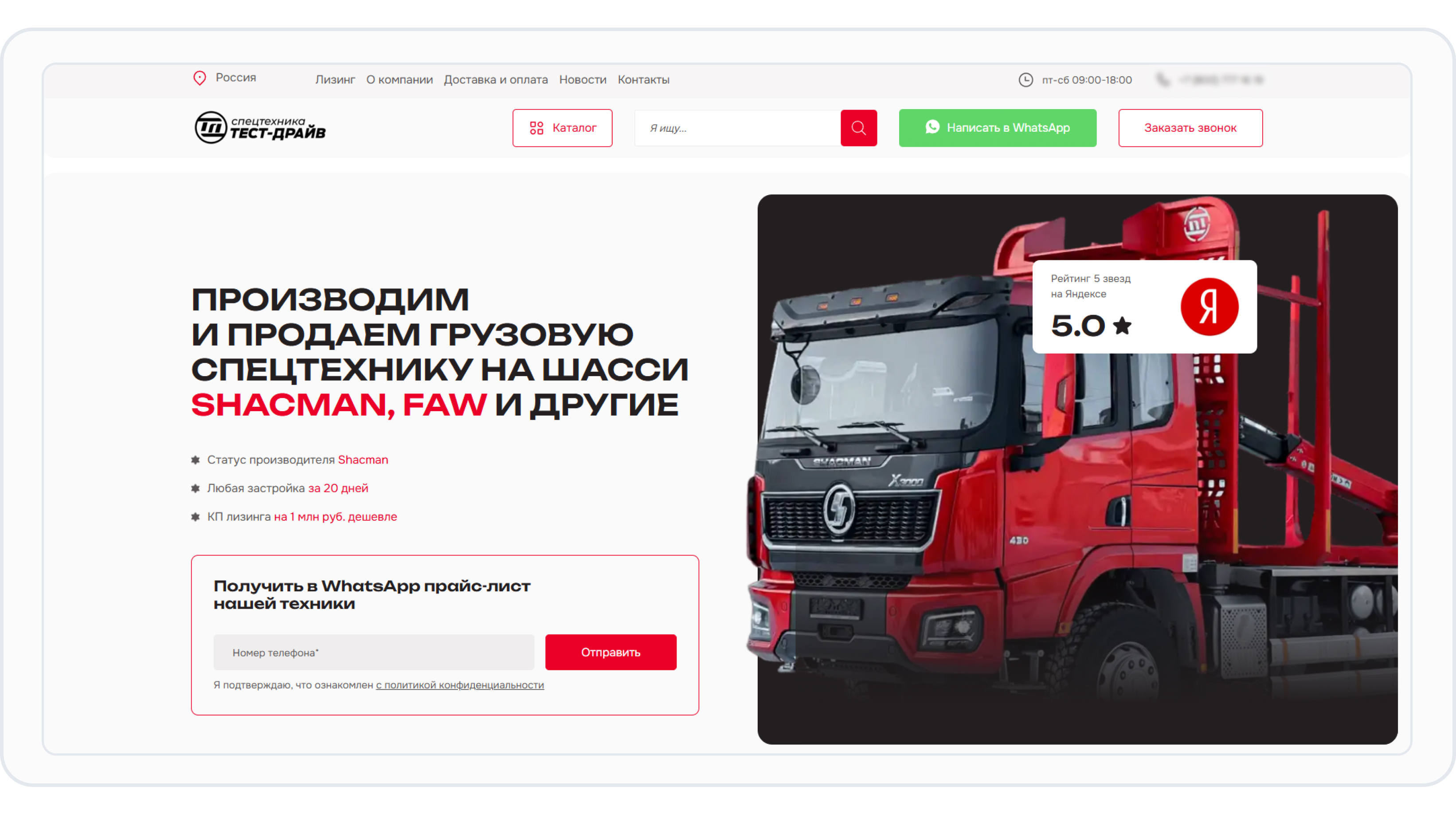 Торговая компания «Тест-Драйв» более 7 лет успешно работает на рынке производства и продажи спецтехники, а также переоборудования автомобилей. С клиентом мы работаем с 2021 года и за это время реализовали вместе 4 проекта: